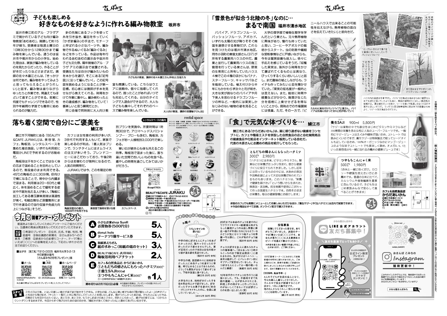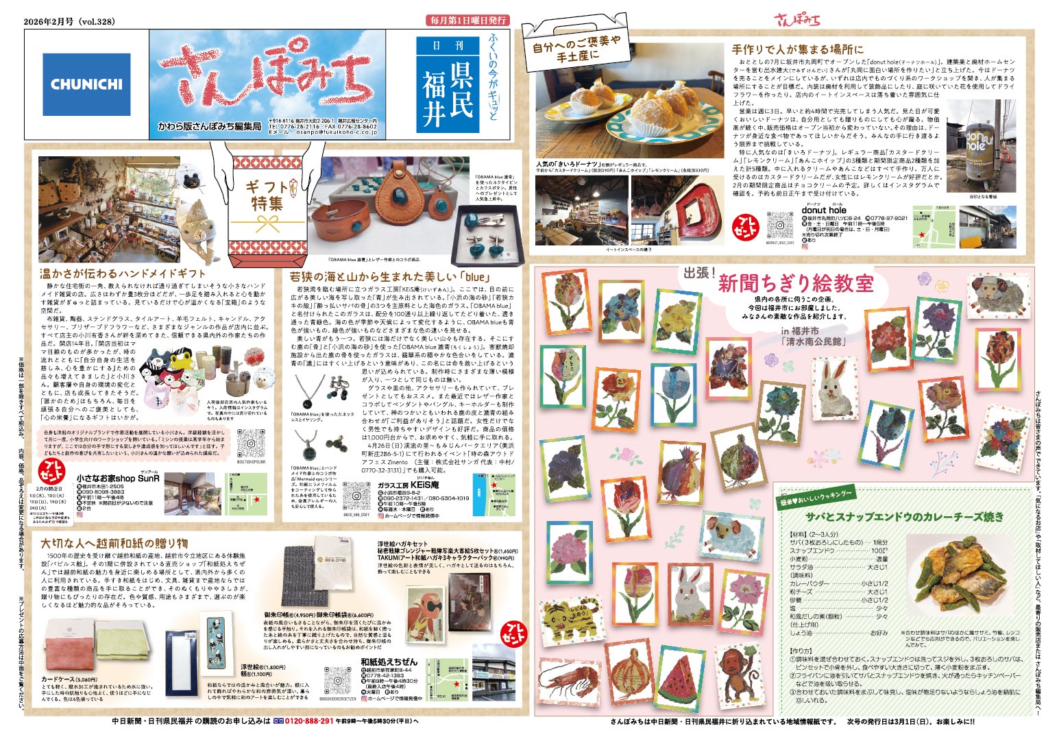 中日新聞と日刊県民福井に、毎月折り込まれている「かわら版さんぽみち」は、福井県内のみなさまにお届けしている地域情報誌です。