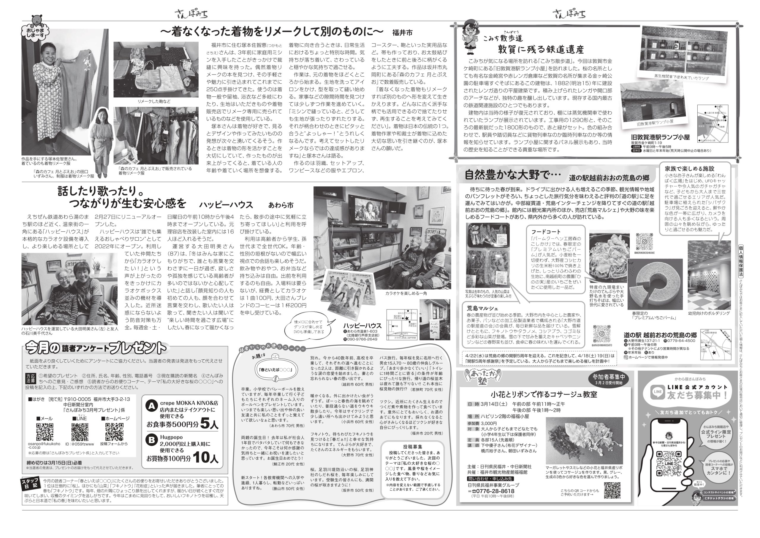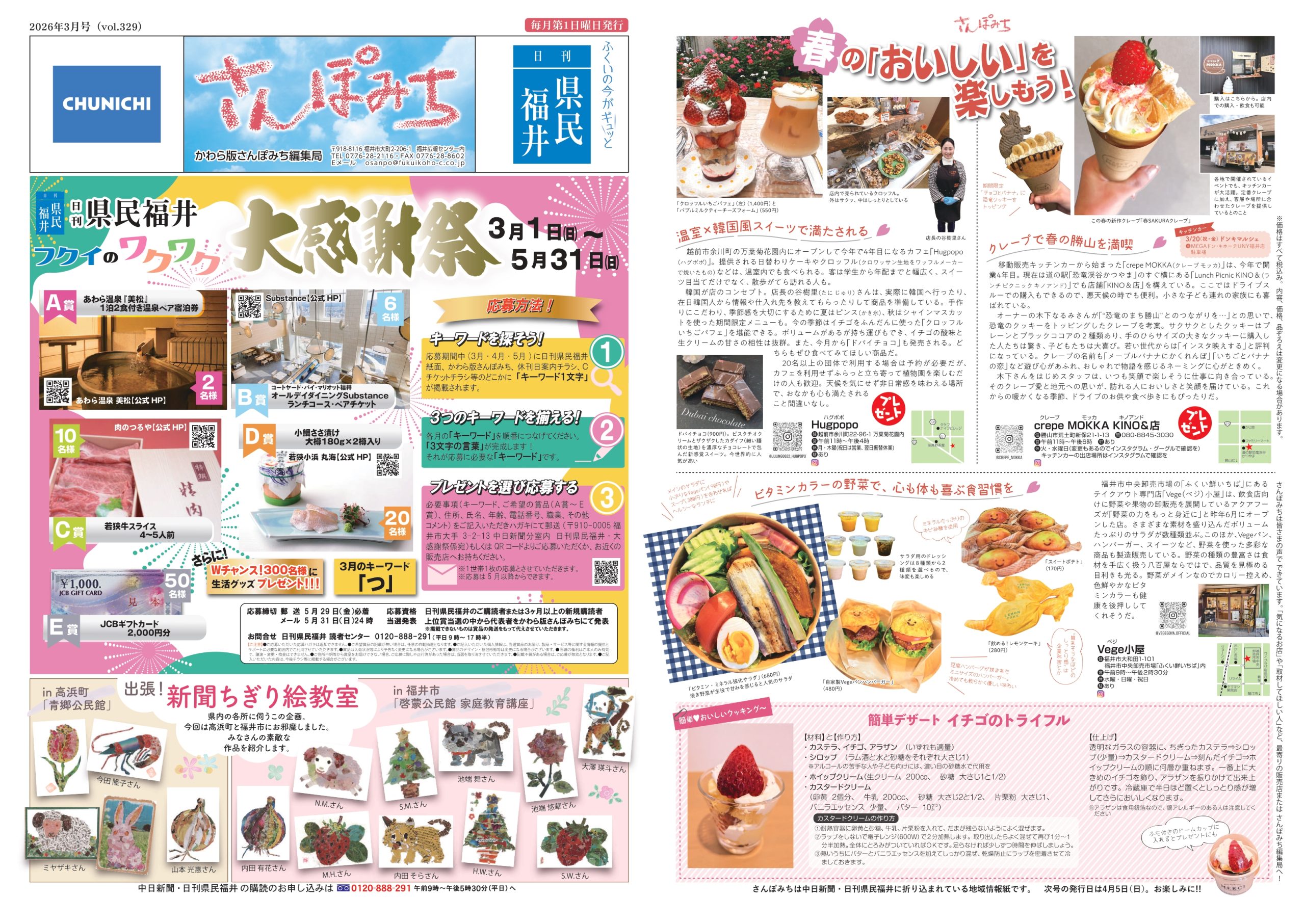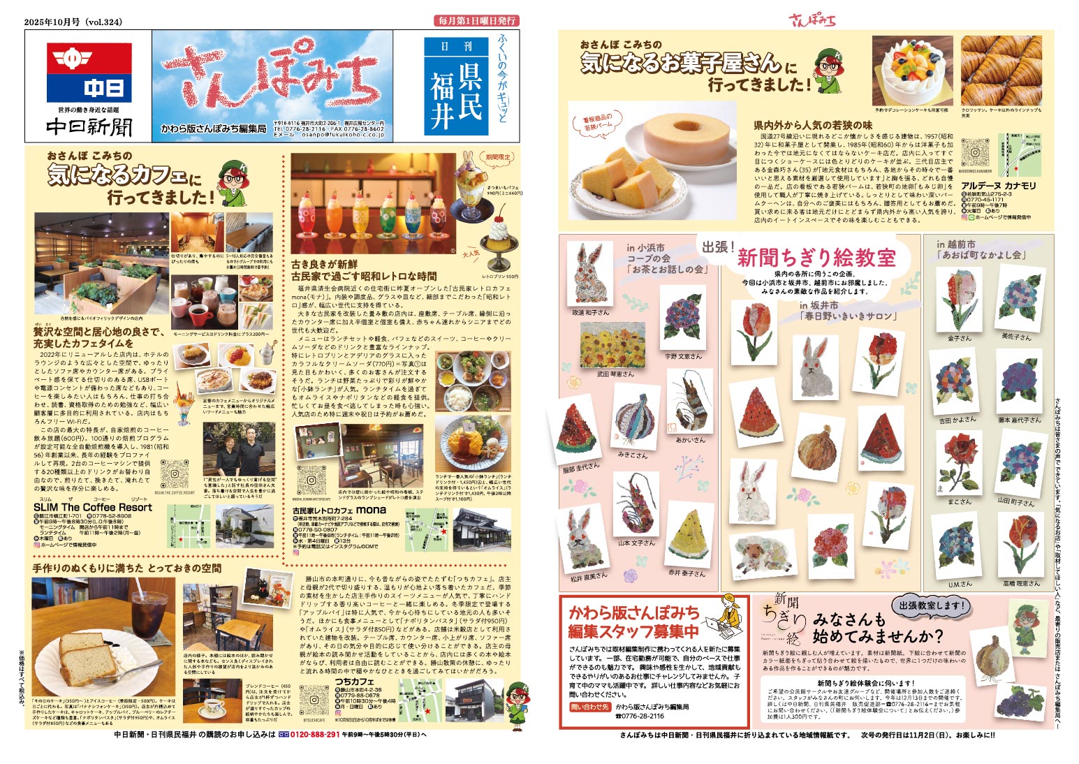 中日新聞と日刊県民福井に、毎月折り込まれている「かわら版さんぽみち」は、福井県内のみなさまにお届けしている地域情報誌です。